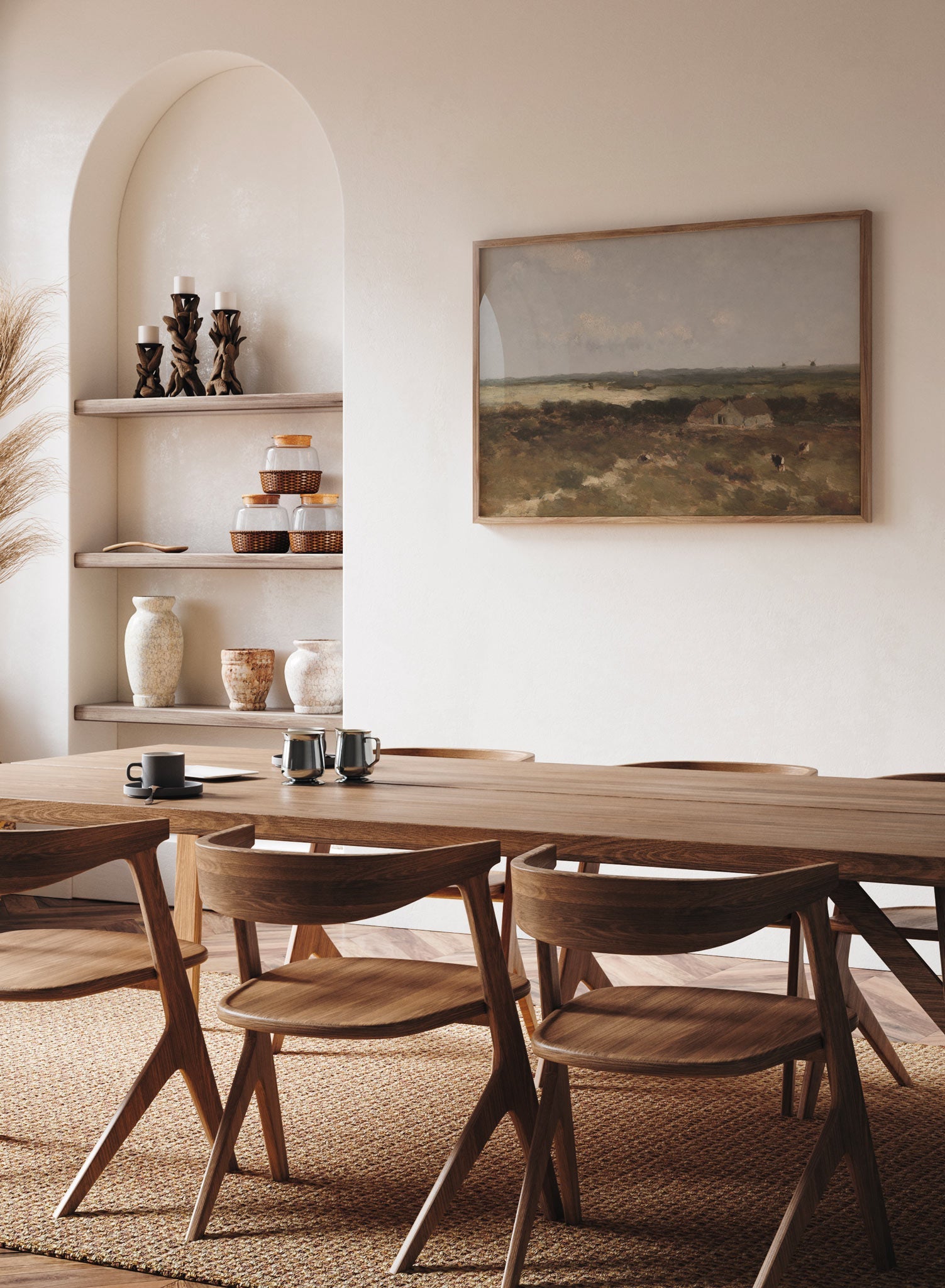 Johan Hendrik Weissenbruch’s ‘Dune Landscape’ is a peaceful farm landscape featuring a house and some cattle at the heart of an open field under a textured blue sky.
