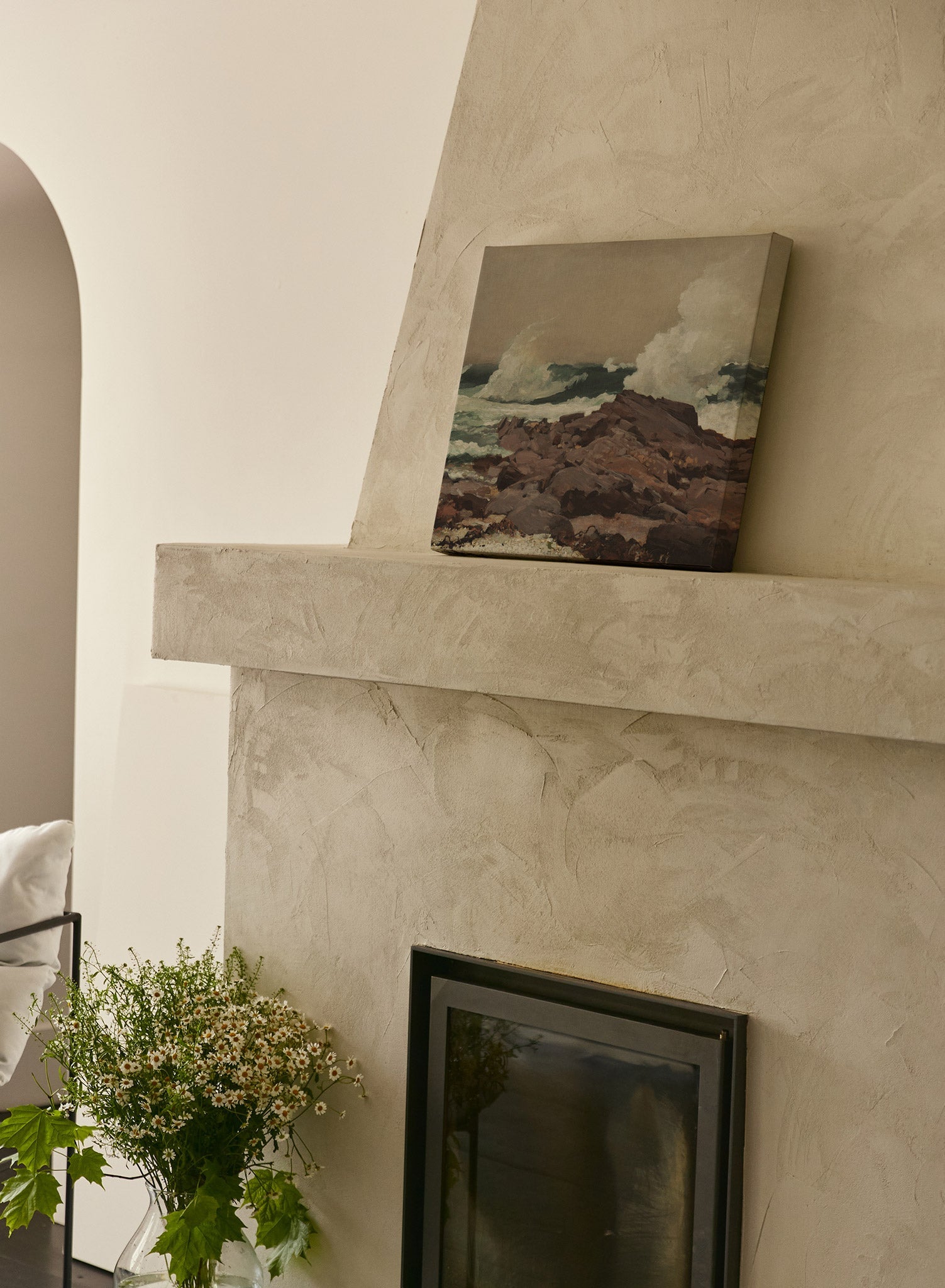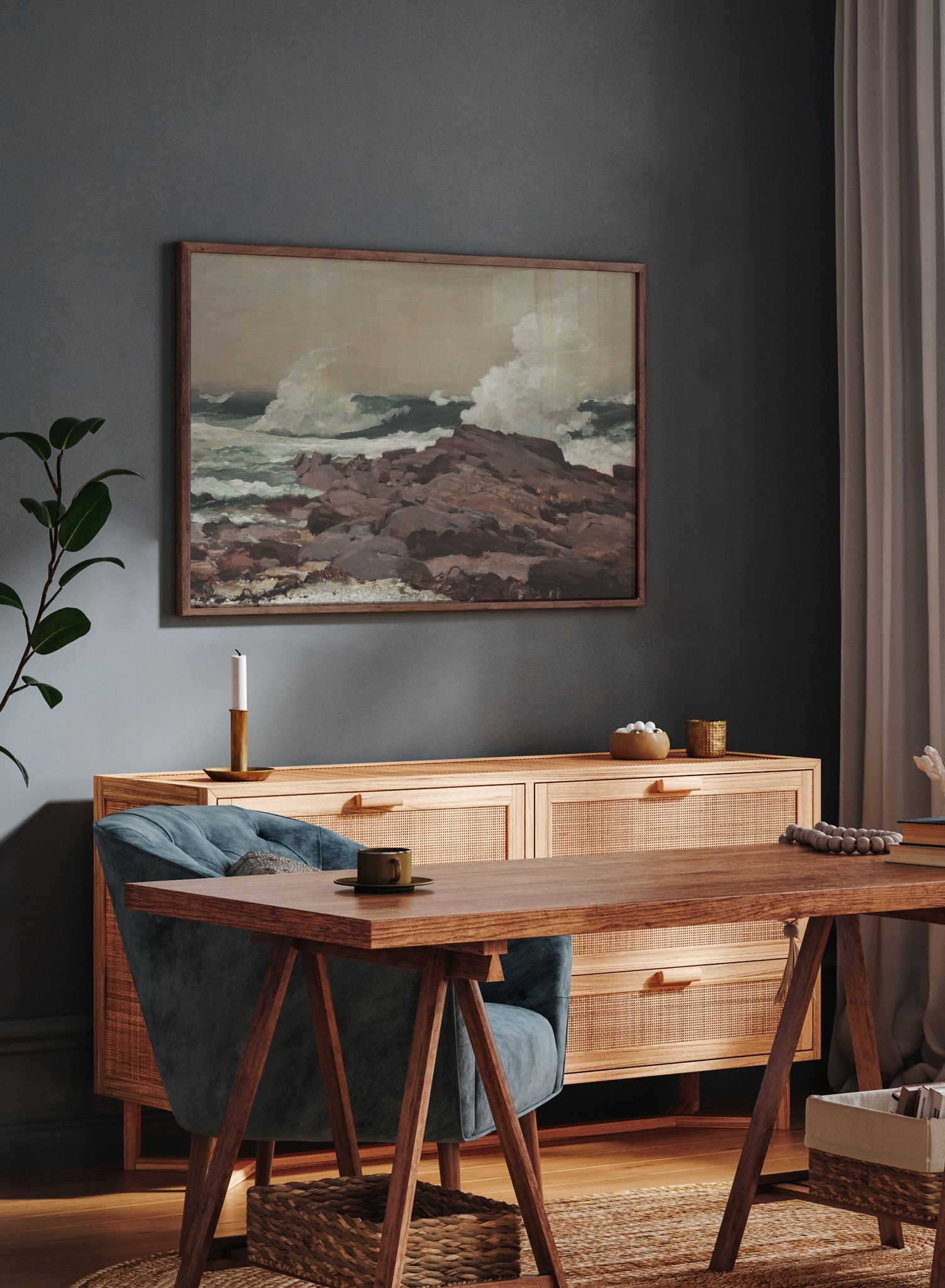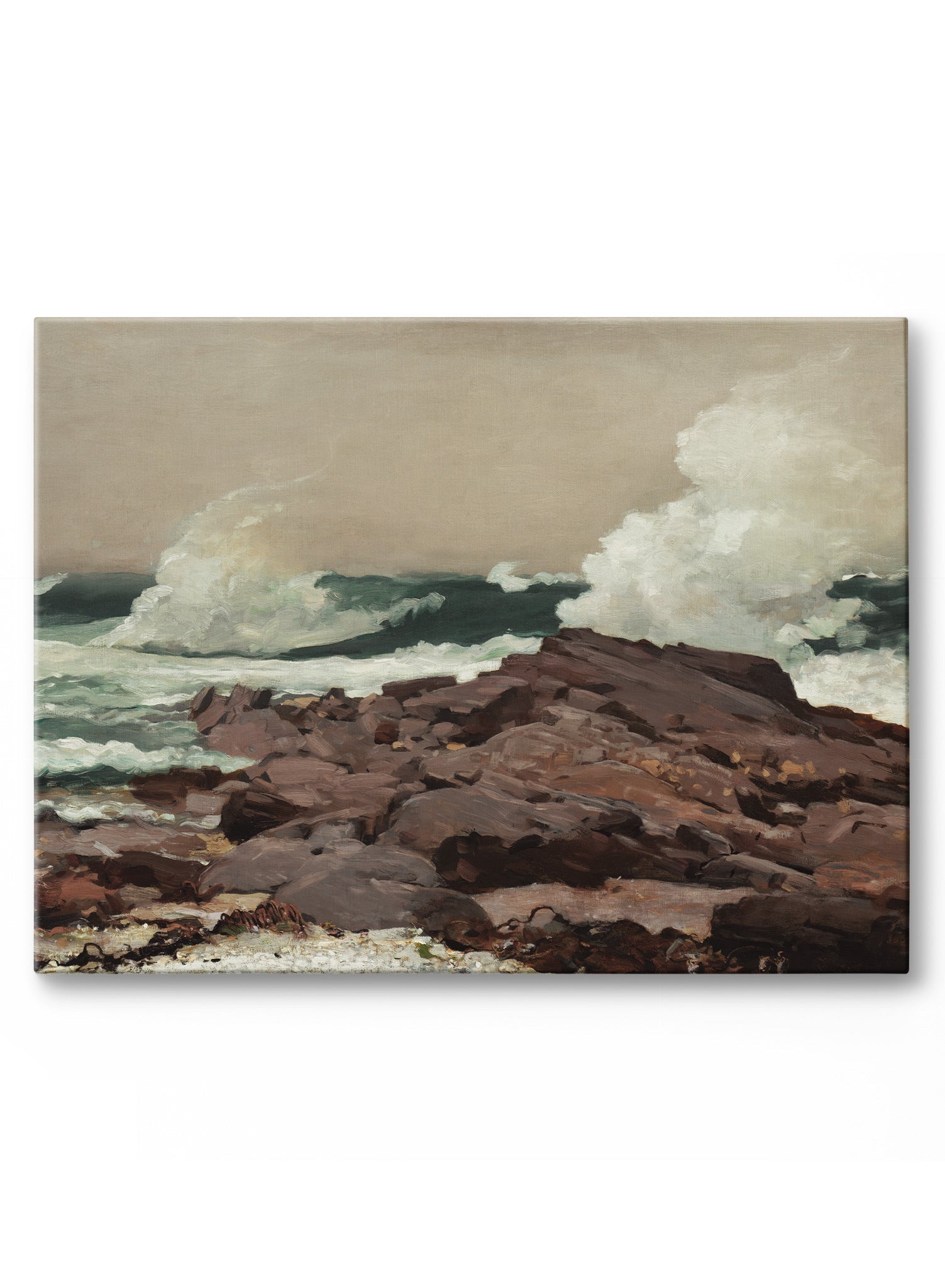 Winslow Homer’s ‘Eastern Point’ is a masterpiece of a painting. This horizontal landscape depicts waves crashing on rocky boulders on a shady day at the beach.